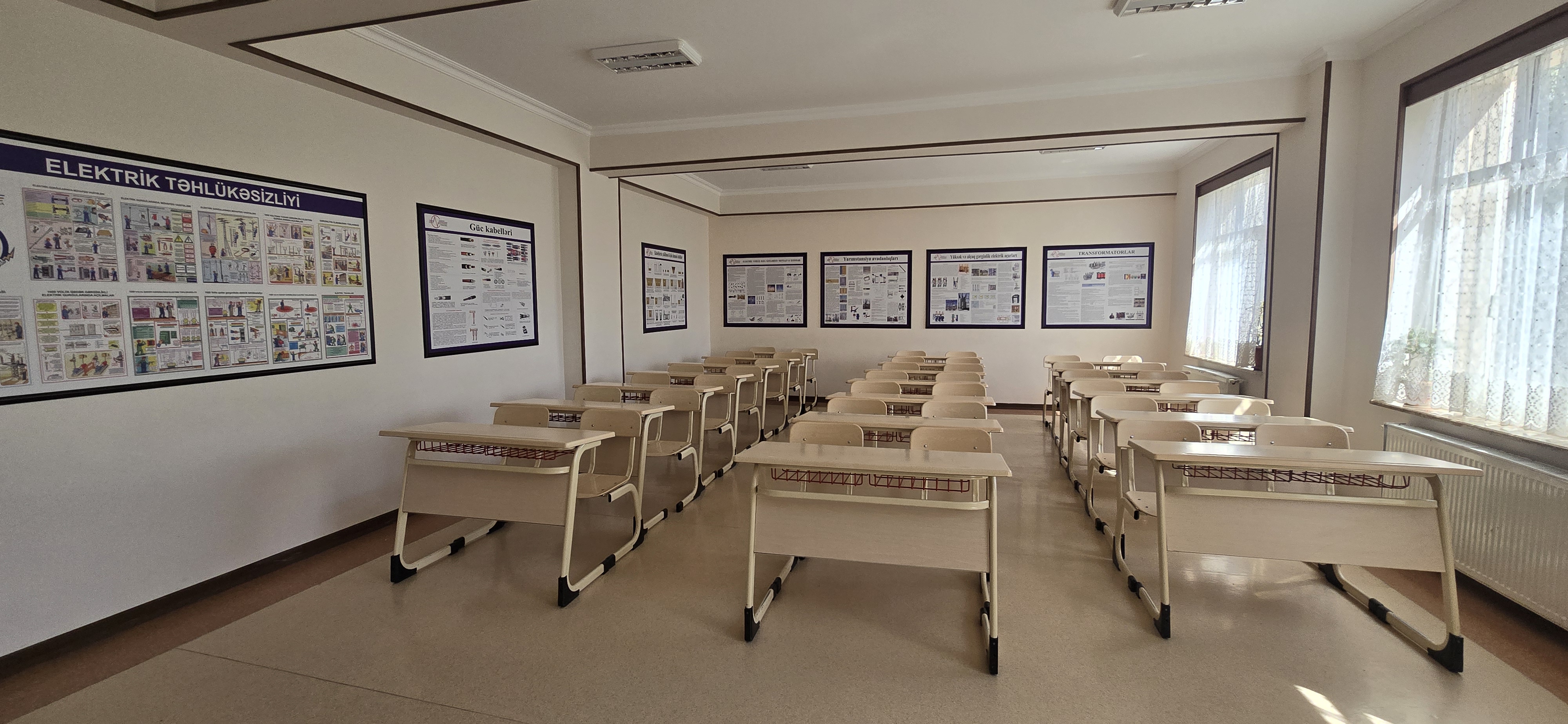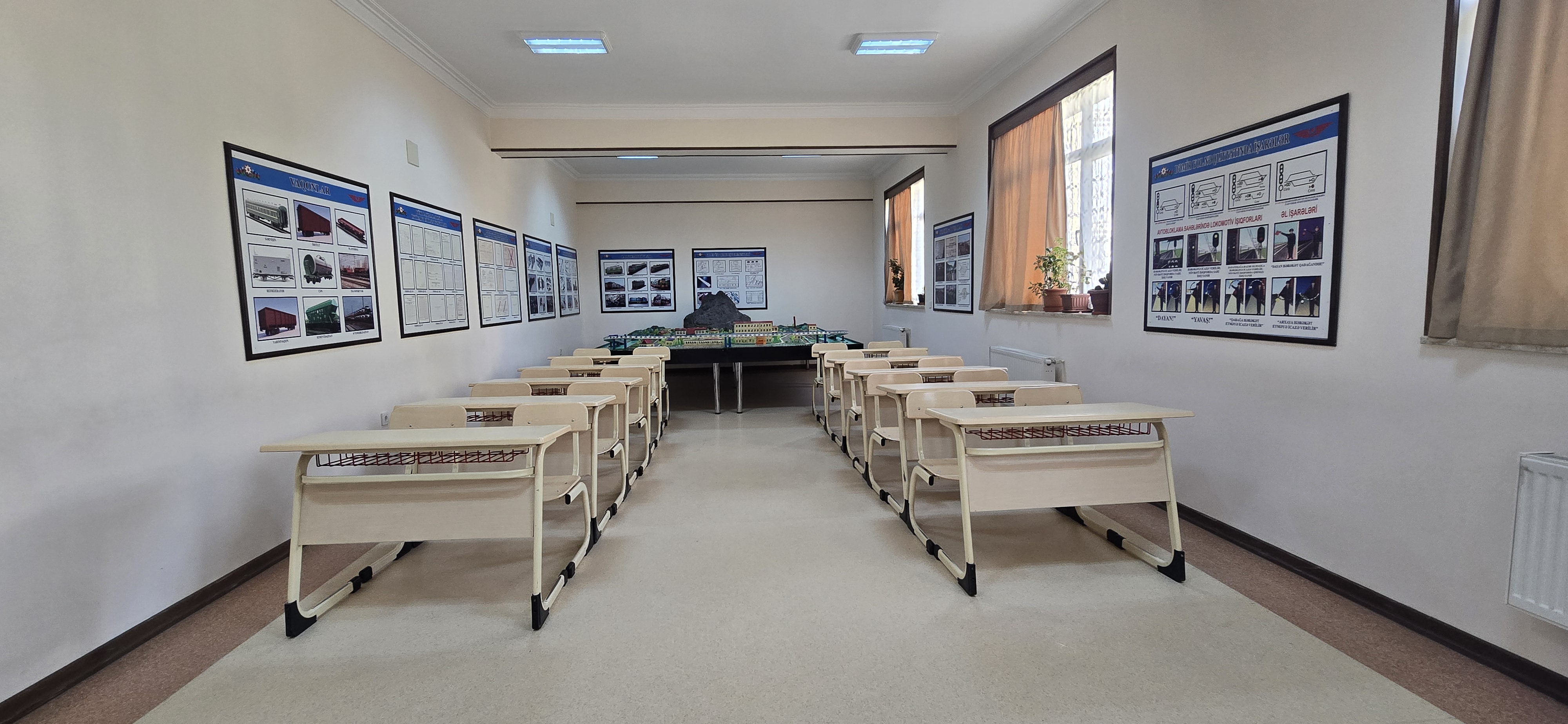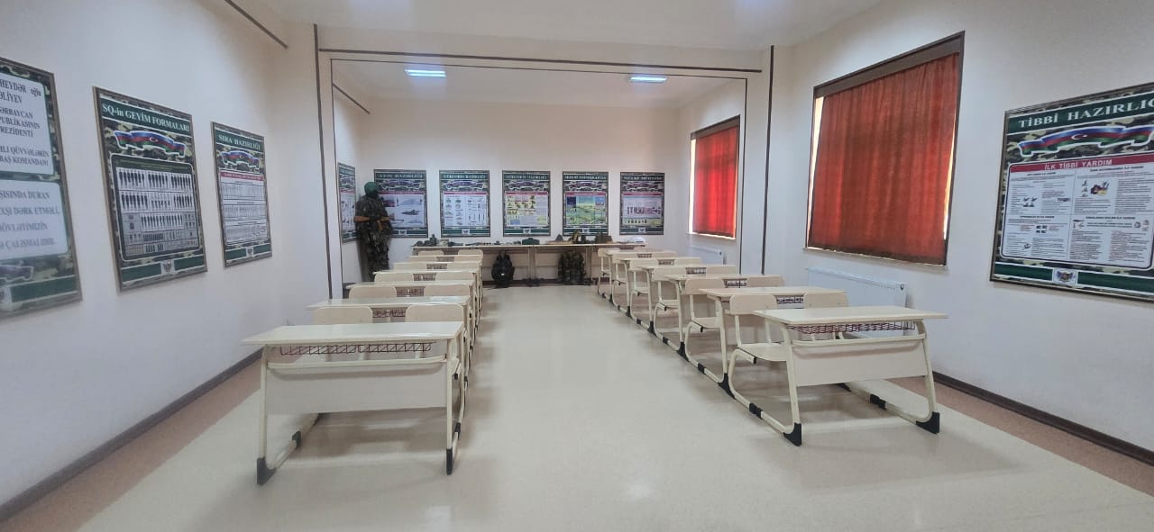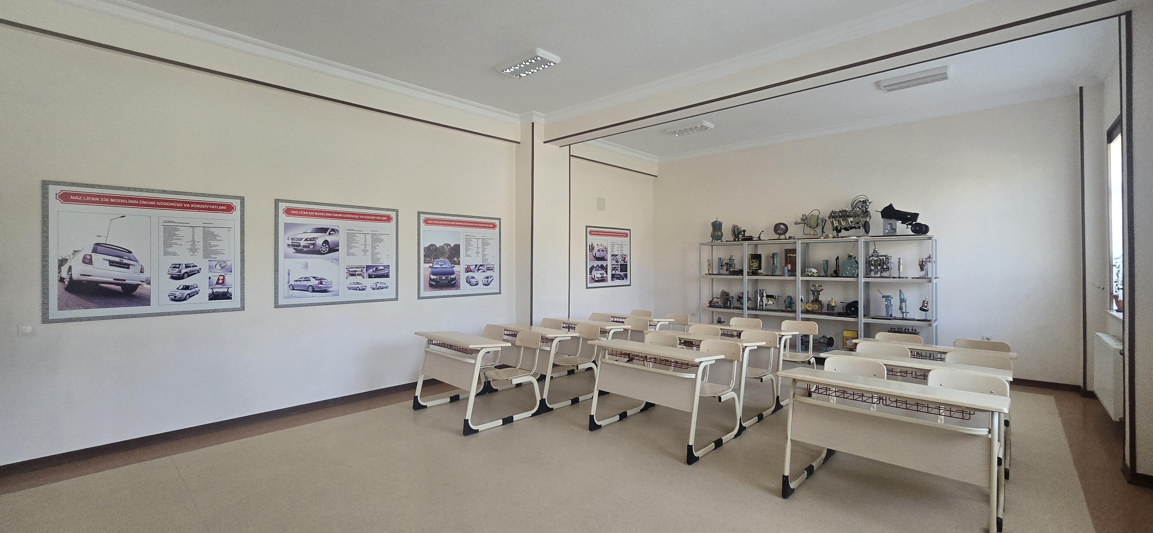 Nəqliyyat vasitələrinin texniki istismarı kabinəsində çarx qolu, 2 sürgü qolu , əyləc ,V şəkilli 8 silindirli mator, porşen , alışqan şamlar, differ, radiator, qranat, sürətlər qutusu, karbirator avadanlıqları var. Kabinədə Nəqliyyat vasitələrinin texniki istismarına aid plakatlar var.