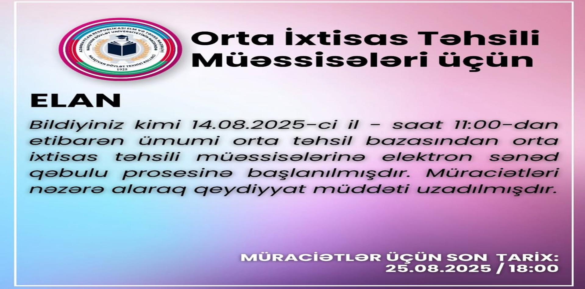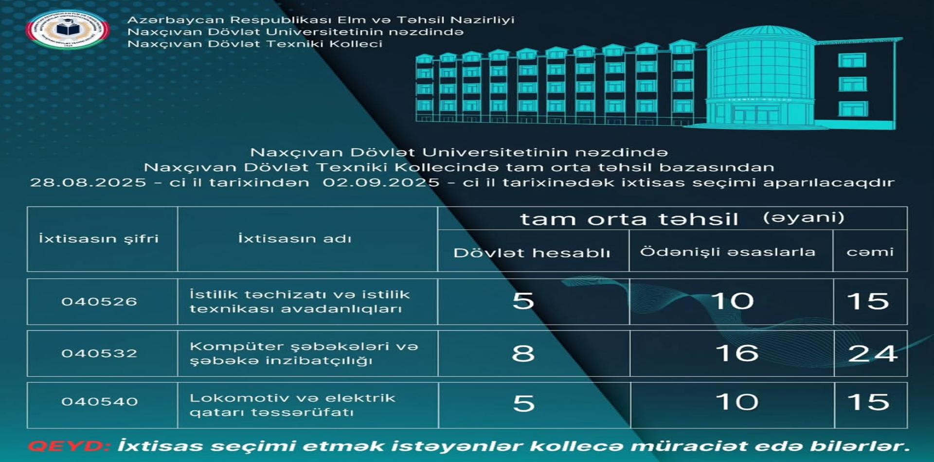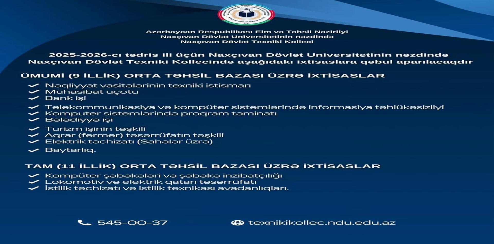 Naxçıvan Dövlət Universitetinin nəzdində Naxçıvan Dövlət Texniki Kolleci, 2025-2026-cı tədris ili üzrə əlavə (təkrar)…